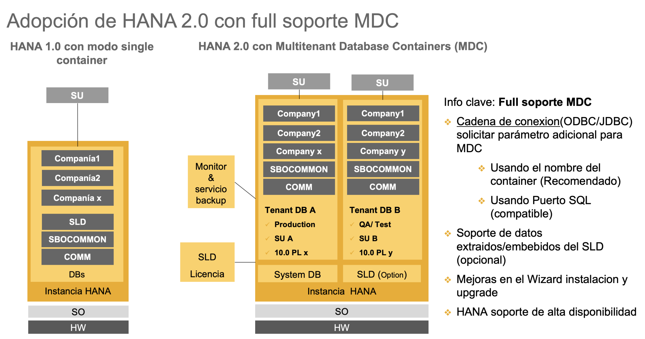 El hecho de que SAP Business One pueda tener ahora HANA 2.0 le da la posibilidad de poder soportar una arquitectura MDC (Contenedores de Bases de datos Multitenant) le permiten de dar soporte de alta disponibilidad, separar ambientes de manera real no como se hacía en versiones anteriores que era lo de duplicar sociedades en una misma instancia emulando "ambientes".